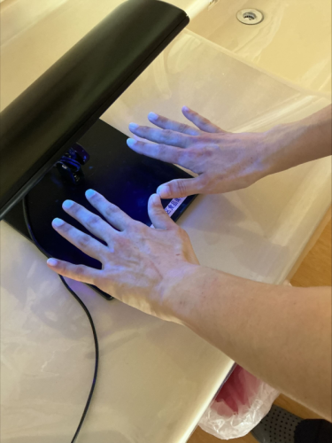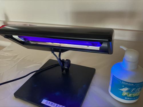 出水保健所様より手洗いチェッカーをお借りし、専用ジェルを使用して汚れ具合をチェック✅