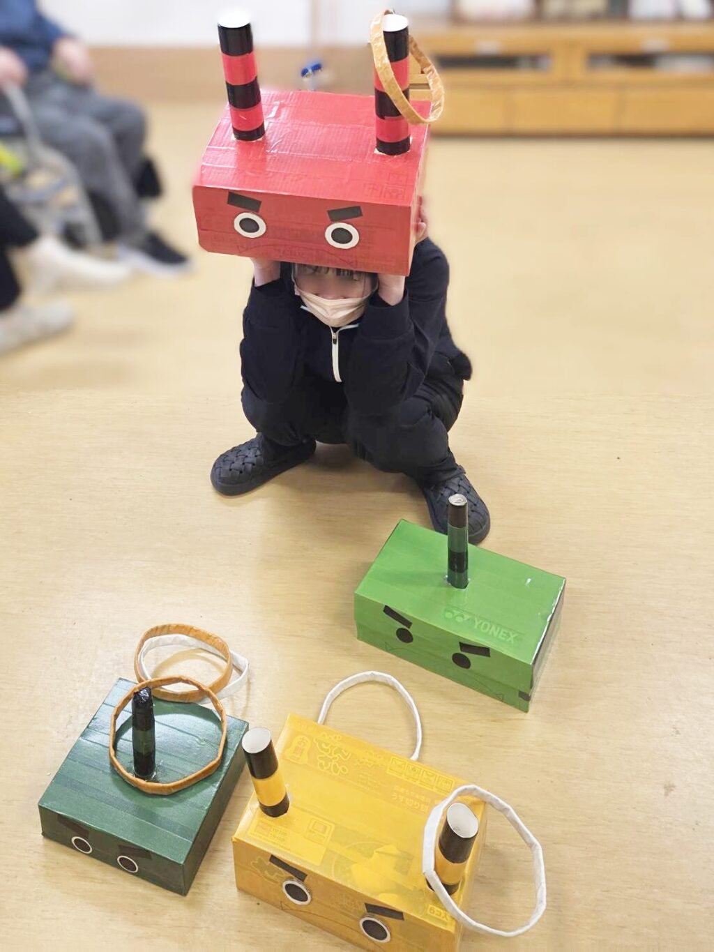 まずは、職員が被った鬼の角が良いマトに見えてきたので角を目掛けて輪投げ( ゚∀゚)o彡°