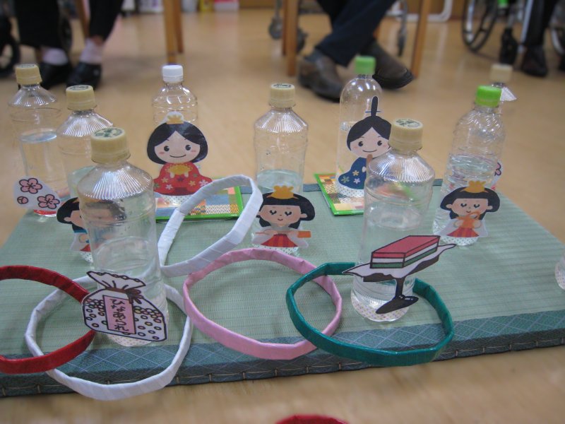 五人囃子とお菓子類を見たてた的に輪投げで確保!